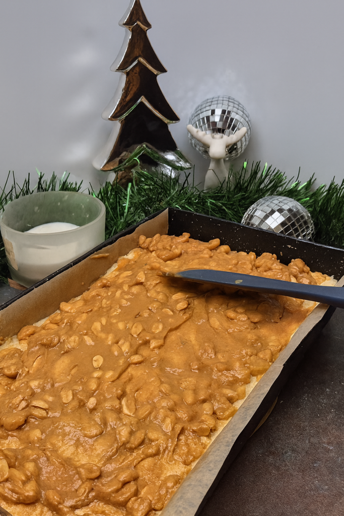 12. Rozprowadź masę orzechowo-kajmakową na wierzchu ciasta.