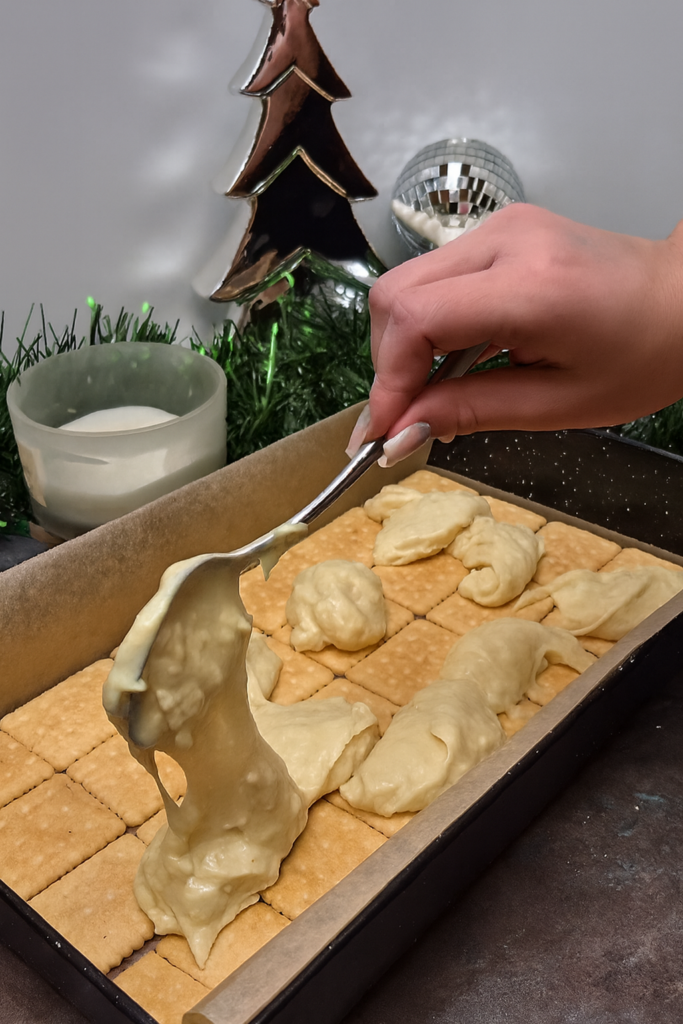 6. Na dnie ułóż pierwszą warstwę herbatników.