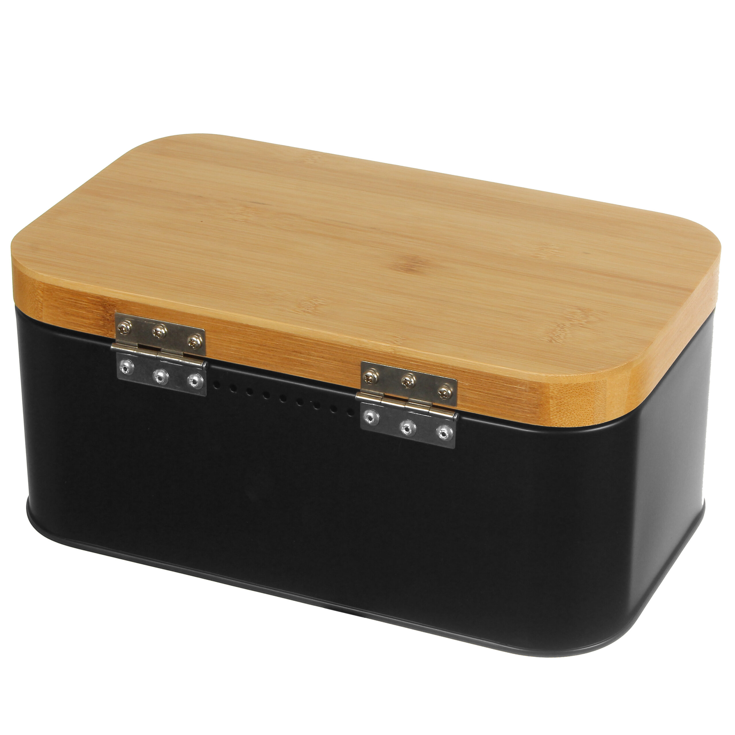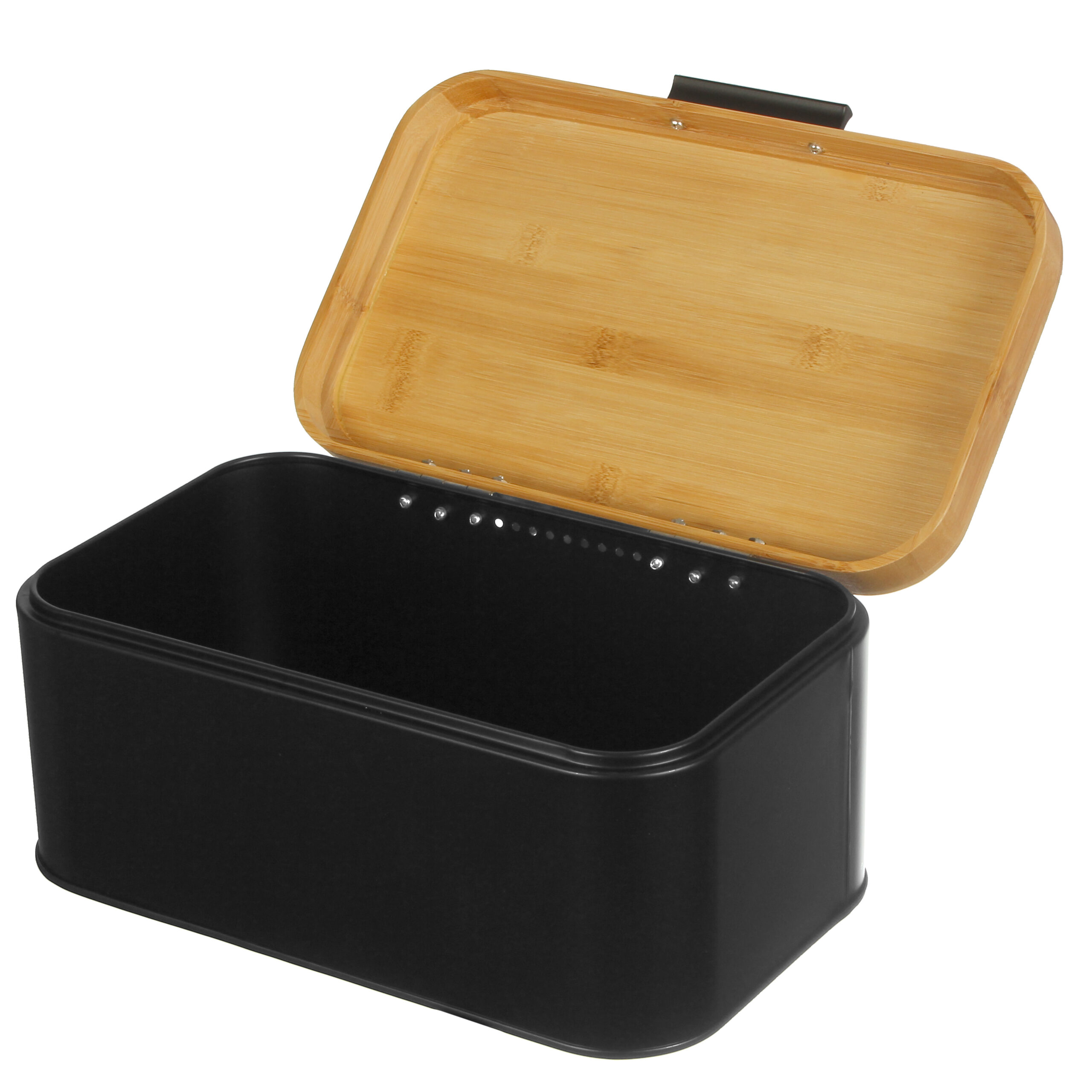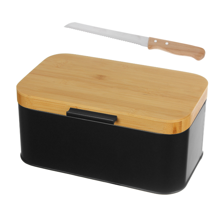 Funkcjonalny chlebak w eleganckim czarnym kolorze pojemnika i stylowej bambusowej pokrywy. Ten nowoczesny chlebak został zaprojektowany, aby zapewnić idealne warunki do przechowywania chleba i innych wypieków, utrzymując je świeżymi na dłużej.