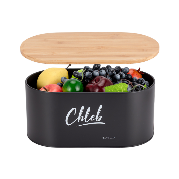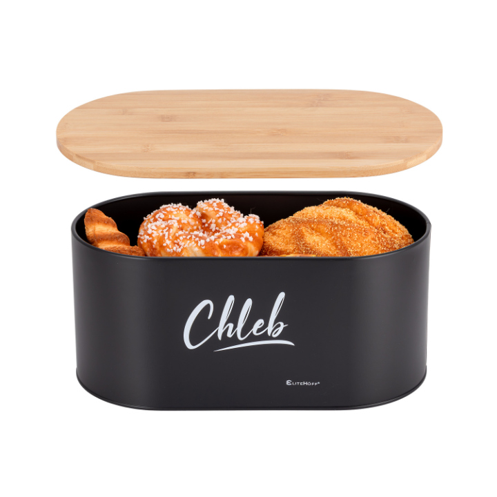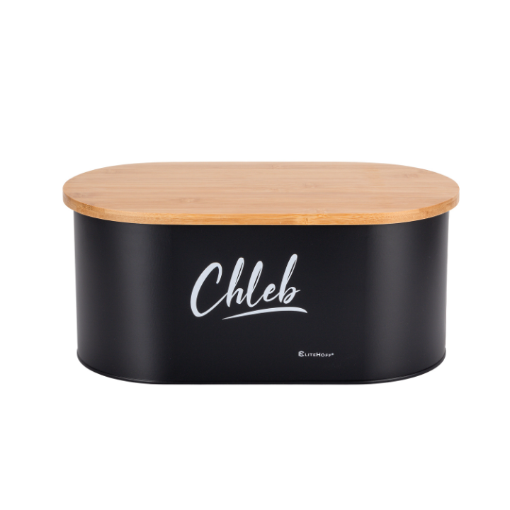 Stylowy chlebak w eleganckim czarnym kolorze pozwala zachować świeżość i chrupkość pieczywa przez dłuższy czas. Dzięki minimalistycznemu designowi z napisem „Chleb” świetnie komponuje się z nowoczesnymi, loftowymi i klasycznymi wnętrzami. Drewniana pokrywa pełni funkcję deski do krojenia, co sprawia, że chlebak jest niezwykle praktyczny w codziennym użytkowaniu.
