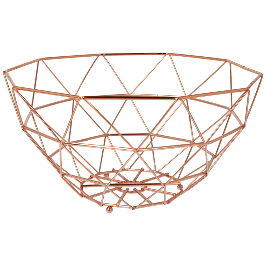 Duży koszyk na owoce o średnicy 30 cm to połączenie funkcjonalności i stylu. Wykonany z wysokiej jakości stali chromowanej w eleganckim kolorze miedzianym, nie tylko organizuje przestrzeń, ale również eksponuje świeże owoce, dodając wnętrzu szyku.