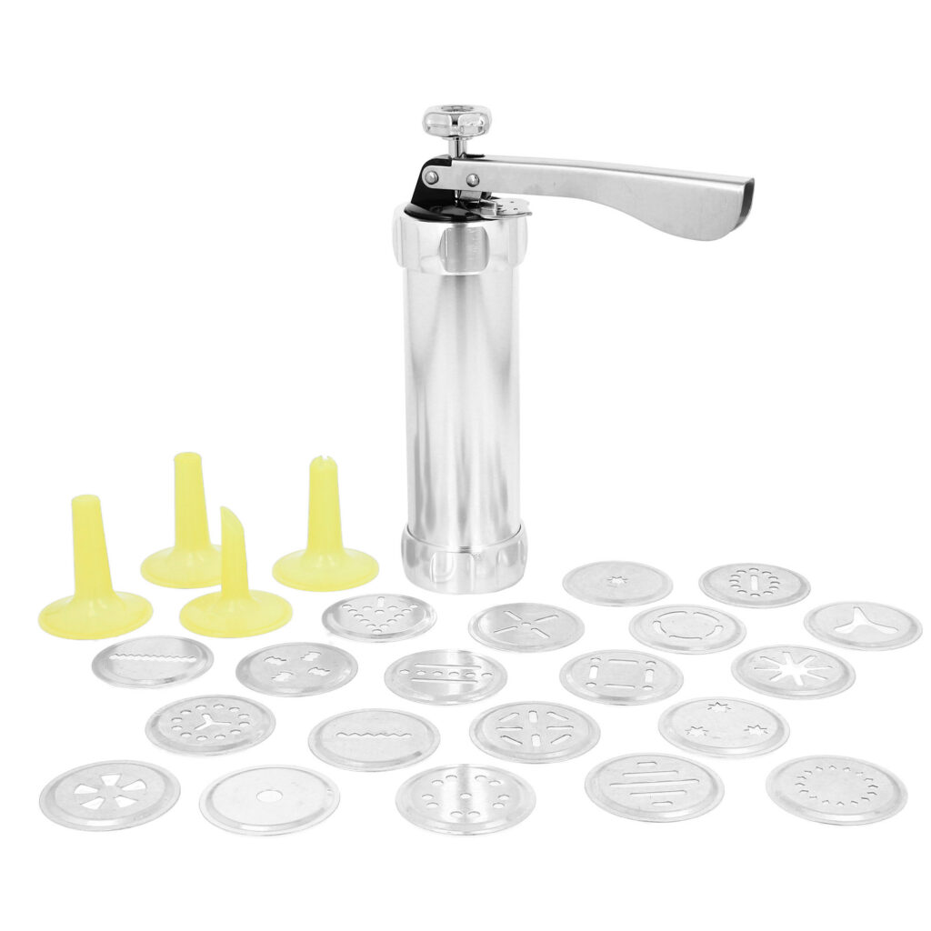 Maszynka do ciastek i dekoracji to niezastąpione narzędzie w kuchni każdego miłośnika wypieków. Wykonana z trwałej stali nierdzewnej, pozwala na przygotowanie ciastek o różnych kształtach oraz efektowne dekorowanie tortów, ciast i innych deserów. Idealna także do nadziewania pączków czy rolad. Dzięki bogatemu zestawowi końcówek, możliwości są praktycznie nieograniczone.