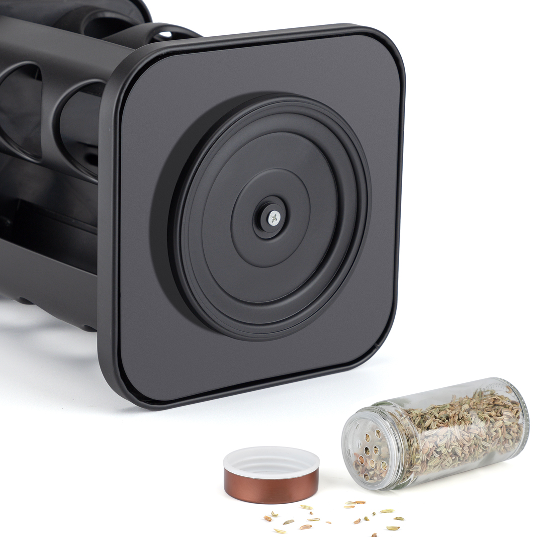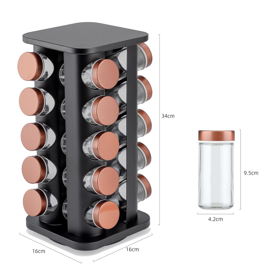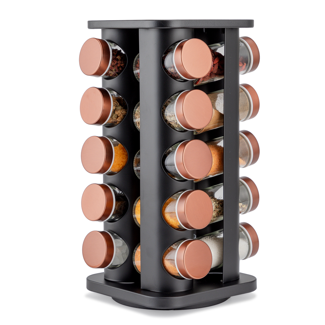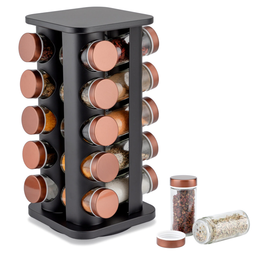 Obrotowy stojak na przyprawy to połączenie funkcjonalności i elegancji, które pozwala w łatwy sposób zorganizować kuchenne przyprawy. W zestawie znajduje się 20 szklanych pojemników oraz stojak w nowoczesnym czarnym kolorze z akcentami w odcieniu miedzi, które nadają całości luksusowy charakter.