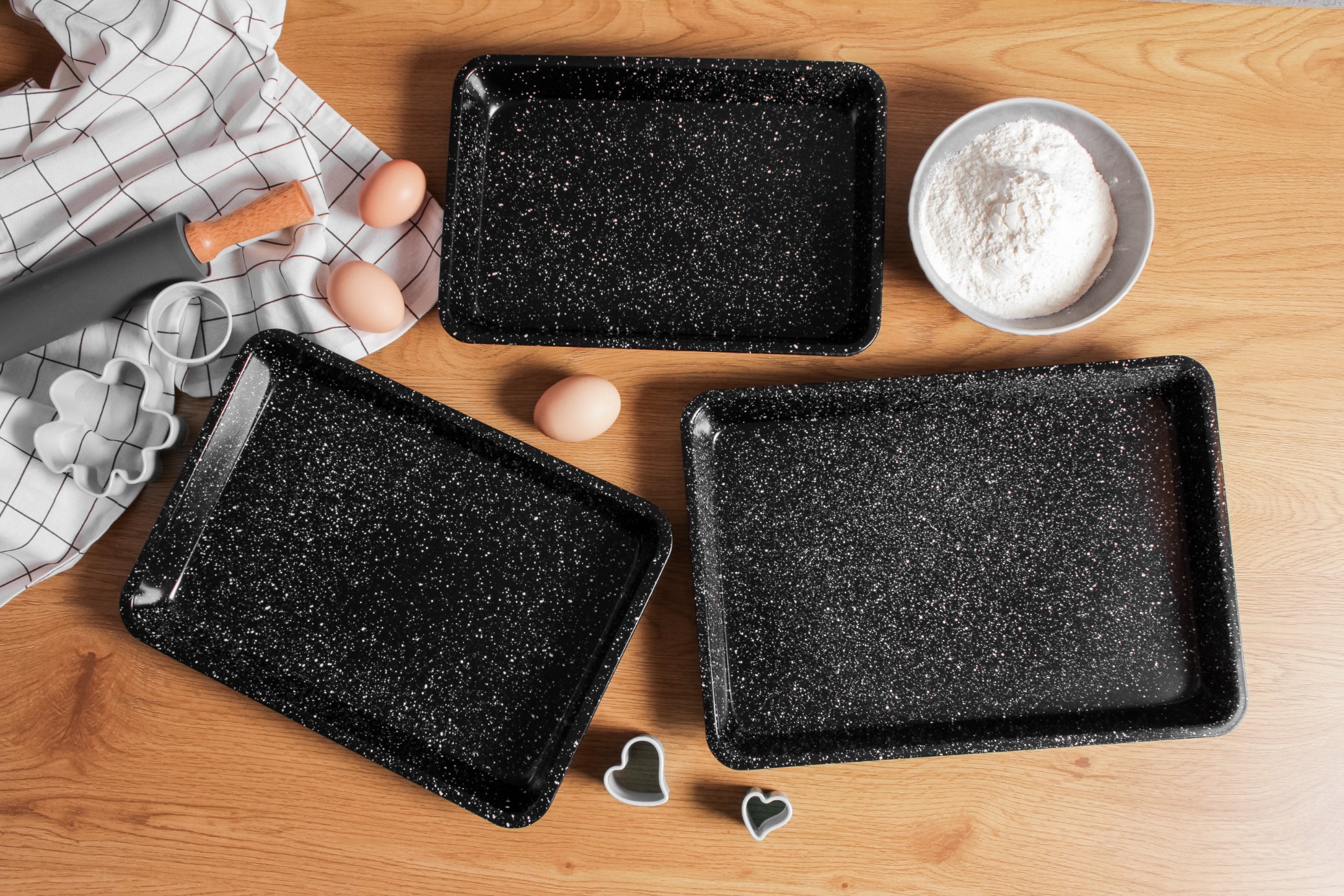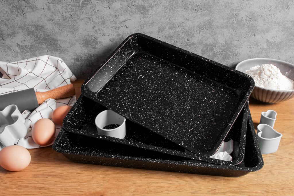 Zestaw trzech form do pieczenia z powłoką non-stick to idealne rozwiązanie dla osób, które cenią sobie wygodę i funkcjonalność w kuchni. Dzięki różnym rozmiarom blach, możesz piec zarówno ciasta, placki, jak i mięsa, dostosowując wielkość formy do swoich potrzeb. Wysokiej jakości stal węglowa oraz powłoka marmurkowa non-stick zapewniają równomierne pieczenie i łatwe wyjmowanie potraw.
