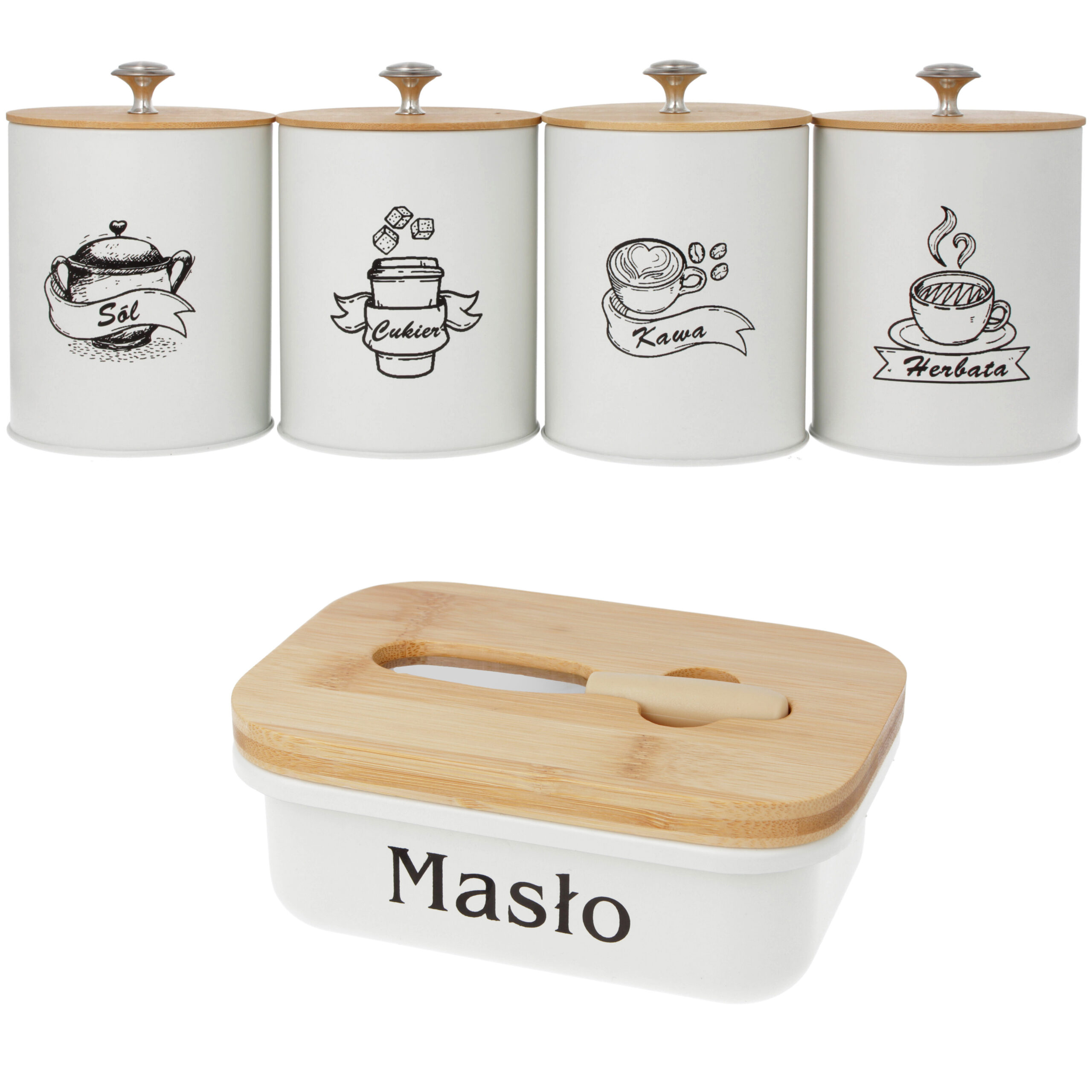 Zestaw składający się z czterech pojemników oraz maselniczki z nożem to doskonałe rozwiązanie do każdej kuchni. Metalowe pojemniki z drewnianymi, bambusowymi pokrywami nie tylko spełniają swoją praktyczną funkcję, ale również stanowią estetyczny dodatek do wnętrza. Ich prosty, uniwersalny design wpasuje się w każdą aranżację, a biały kolor dodaje elegancji.