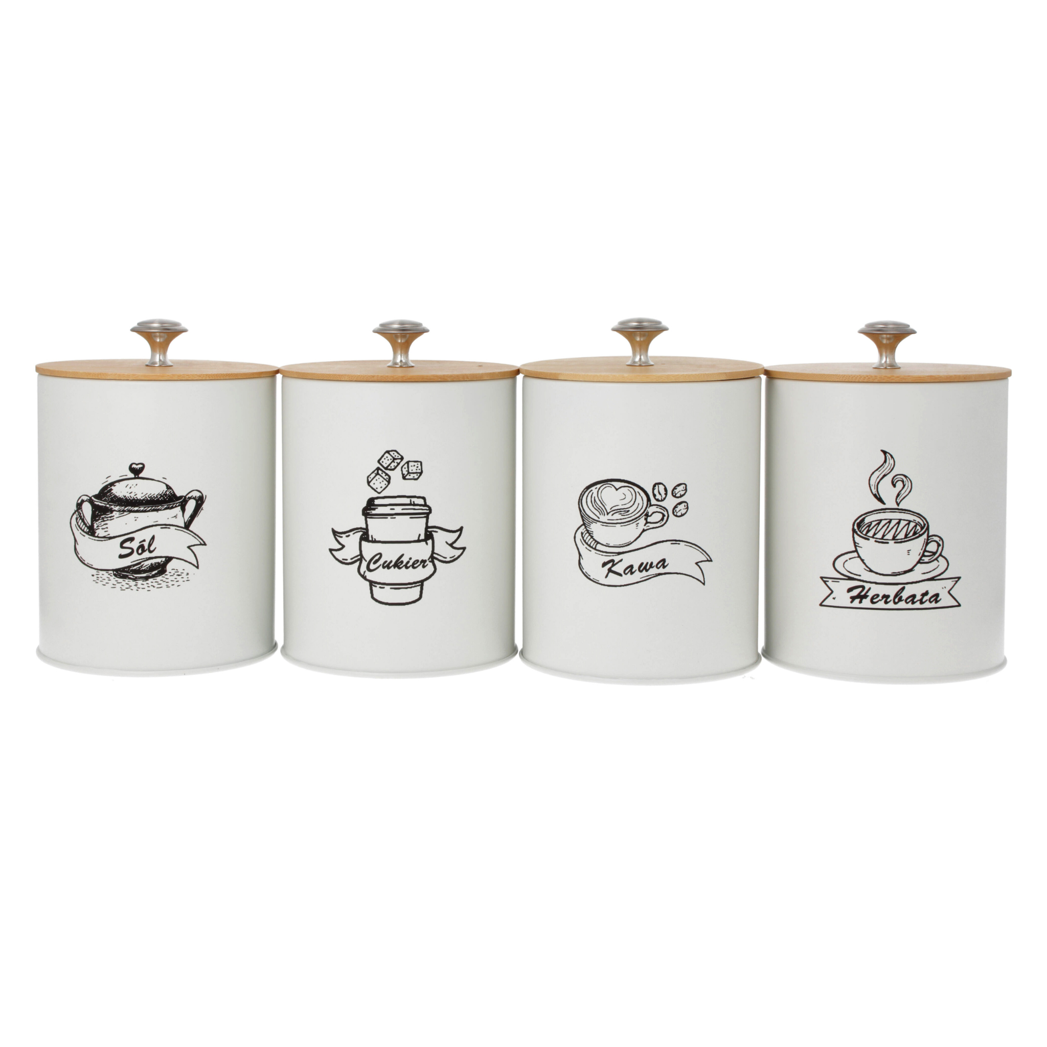 • Praktyczne pojemniki: Zestaw zawiera cztery pojemniki przeznaczone do przechowywania herbaty, kawy, cukru oraz soli. Każdy z pojemników jest wykonany z trwałej stali i wyposażony w pokrywę z naturalnego bambusa, co zapewnia świeżość przechowywanych produktów.