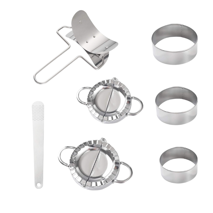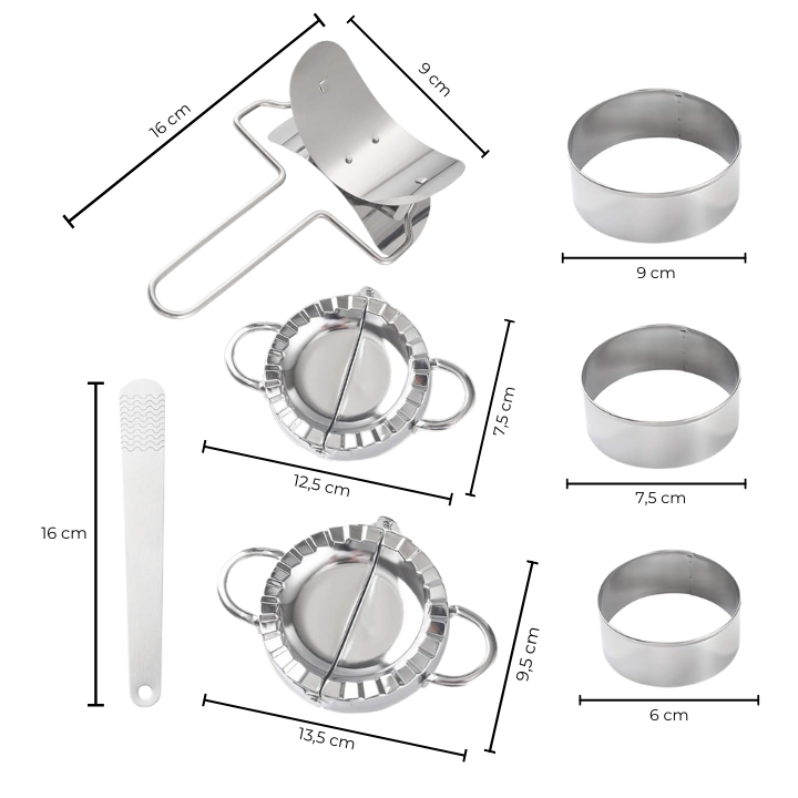 Lepienie pierogów jeszcze nigdy nie było tak proste i przyjemne! Zestaw do lepienia pierogów składa się z 7 przyborów wykonanych z wysokiej jakości stali nierdzewnej to niezastąpiony pomocnik w każdej kuchni. Idealny do przygotowania pierogów na Wigilię, Boże Narodzenie czy codzienne obiady.