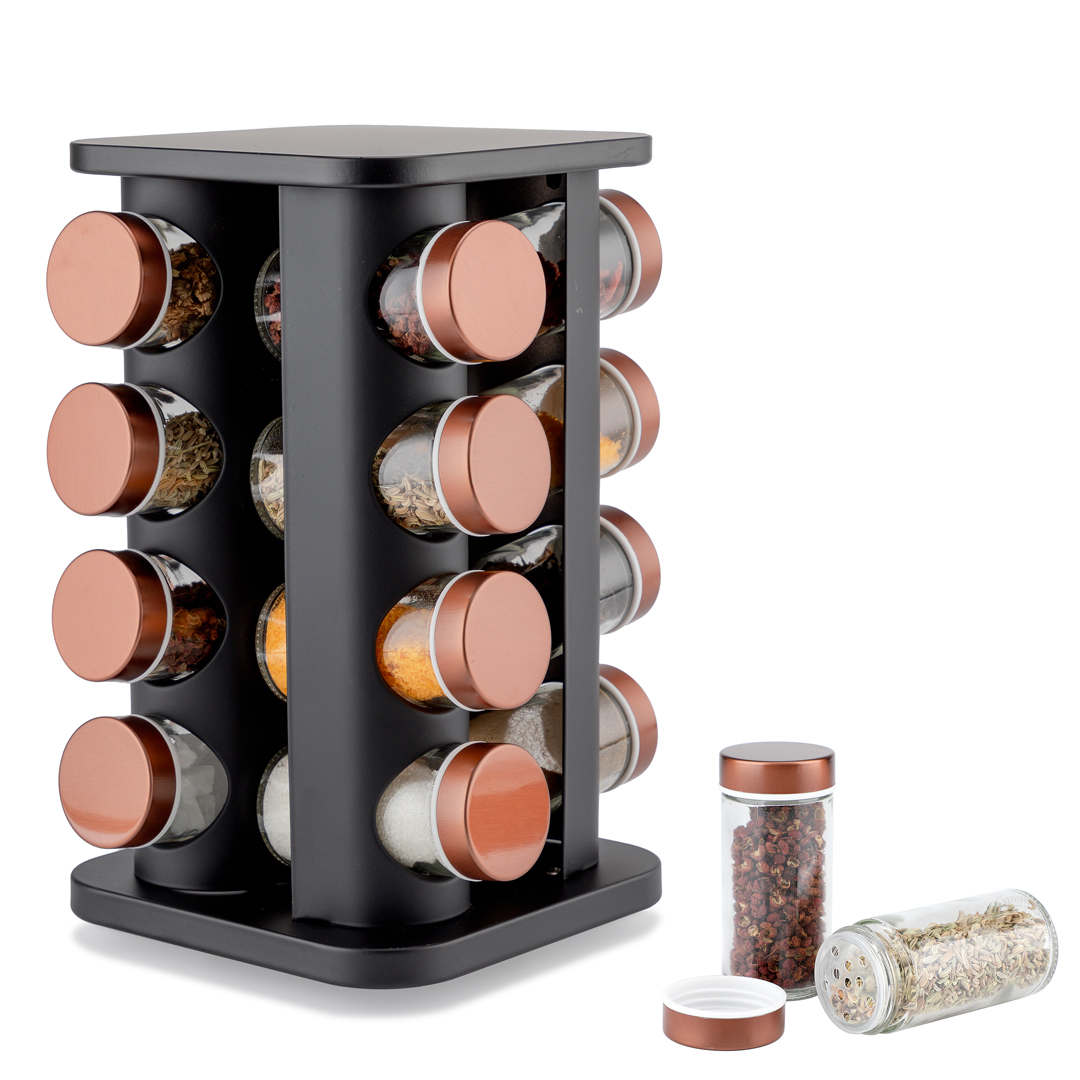 Obrotowy stojak na przyprawy z 16 słoiczkami – wykonany z dbałością o szczegóły, w identycznej stylistyce, z eleganckimi nakrętkami w kolorze różowego złota. Dzięki niemu przyprawy są zawsze pod ręką, a kuchnia pozostaje doskonale zorganizowana.